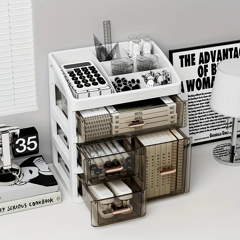 Descubra a Caixa Organizadora de Cosméticos com Gavetas, a solução perfeita para manter seus produtos de beleza impecavelmente organizados e acessíveis. Com um design moderno e sofisticado, esta caixa não só otimiza o espaço da sua bancada, mas também protege seus itens contra poeira e desordem.